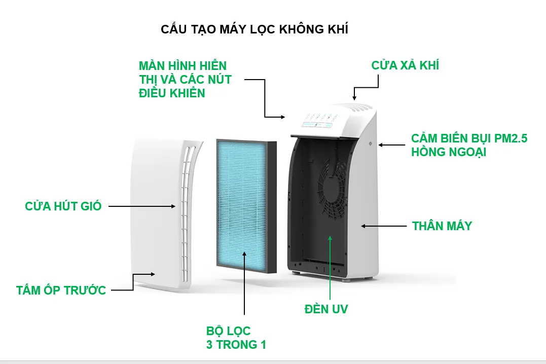 - Bộ lọc 3 trong 1: Cần thay mới sau 9 – 12 tháng. Đèn báo F.T trên máy sẽ tự động nhắc nhở khi bộ lọc bị nghẹt bụi quá mức. Tuyệt đối không rửa bộ lọc này bằng nước vì sẽ làm hỏng cấu trúc nano của màng lọc HEPA.